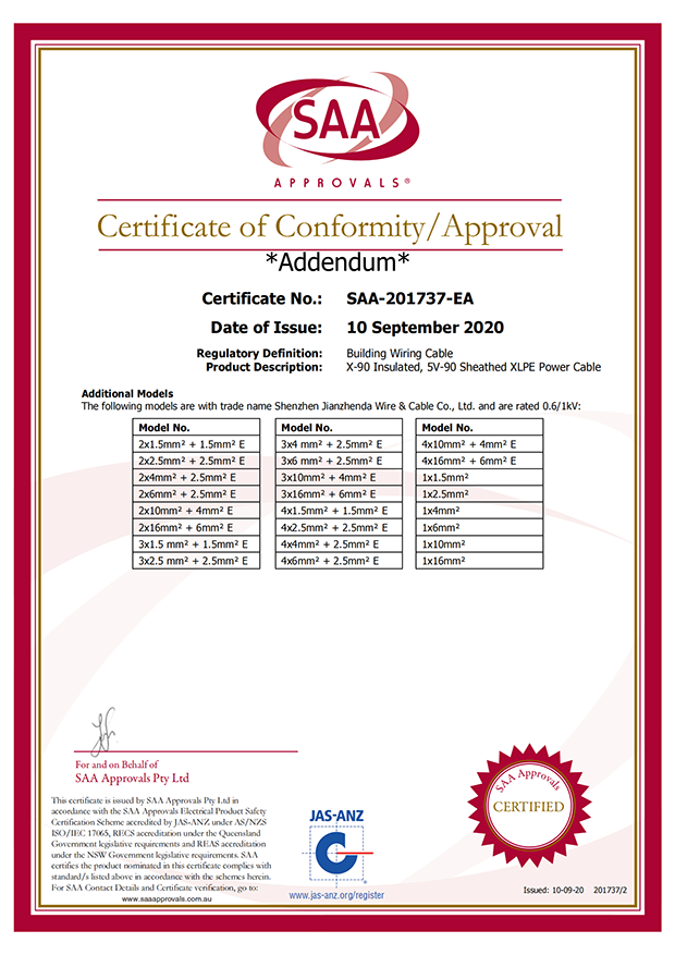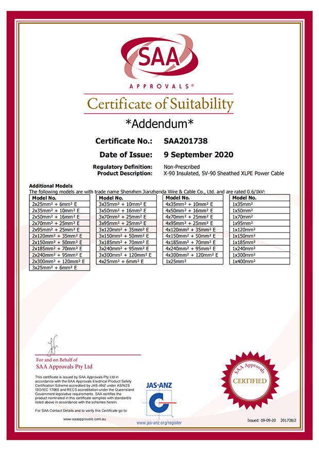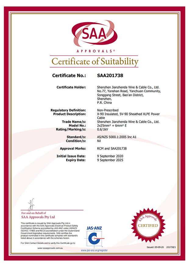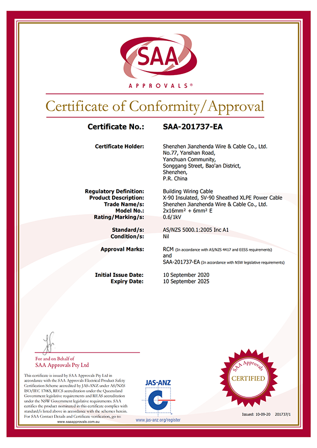 深圳建圳達電線電纜有限公司,成立于2000年,是一家電線電纜制造商,我們通過了世界各地不同市場的多數(shù)認證,如:CCC、RoHS、CB、SAA、TUV、VDE、PSE、BPS、UL、CSA。我們根據(jù)定制產(chǎn)品不斷更新新的認證。經(jīng)過數(shù)十年的發(fā)展,我們與來自世界各地的客戶建立了長期的合作關系。我們曾經(jīng)是菲律賓機場,,柬埔寨的電力站,美國的醫(yī)院,工廠,埃塞俄比亞的水電站項目。我們是一家值得信賴的電線供應商。